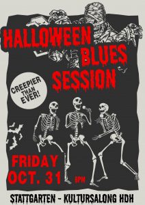 Hey Leute, nun stehen uns tolle Auftritte bevor. Jetzt kommt die Halloween Blues Session im Stattgarten am 31.10. Und als wenns noch nicht genug wäre, machen wir am 5.12. und 6.12. einen Livemitschnitt unserer Musik in der Halben Treppe in Heidenheim. Hier sind die Karten rar, weil jeweils nur 50 Leute reingehen. Hier ist der Link für den Vvk. für den 5.12. und 6.12. KLICK HIER